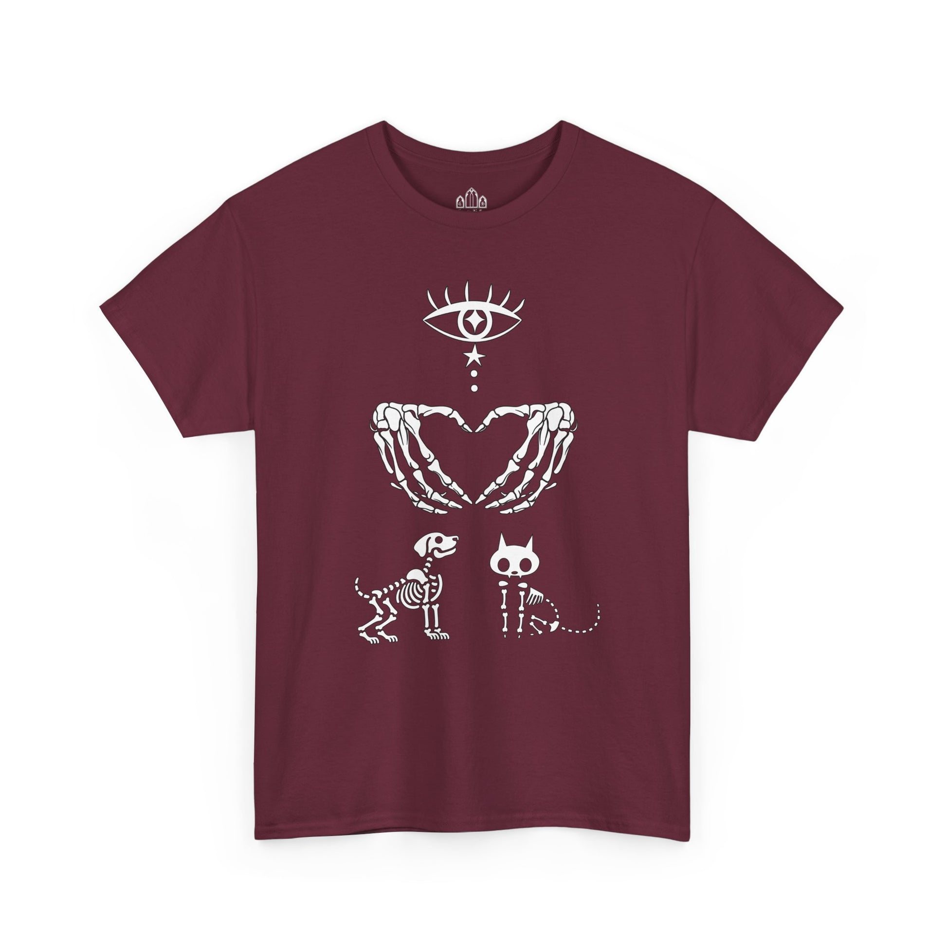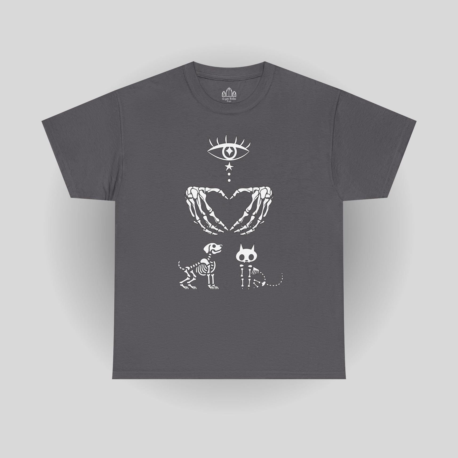 This Tee features a design of skeleton hands with the phrase 'I love cats and dogs', perfect for spooky animal lovers. The classic fit and versatile design make it a great addition to any casual outfit. Ideal for adults who love animals and want to add a touch of spooky fun to their wardrobe. Perfect for Halloween and animal-related events.