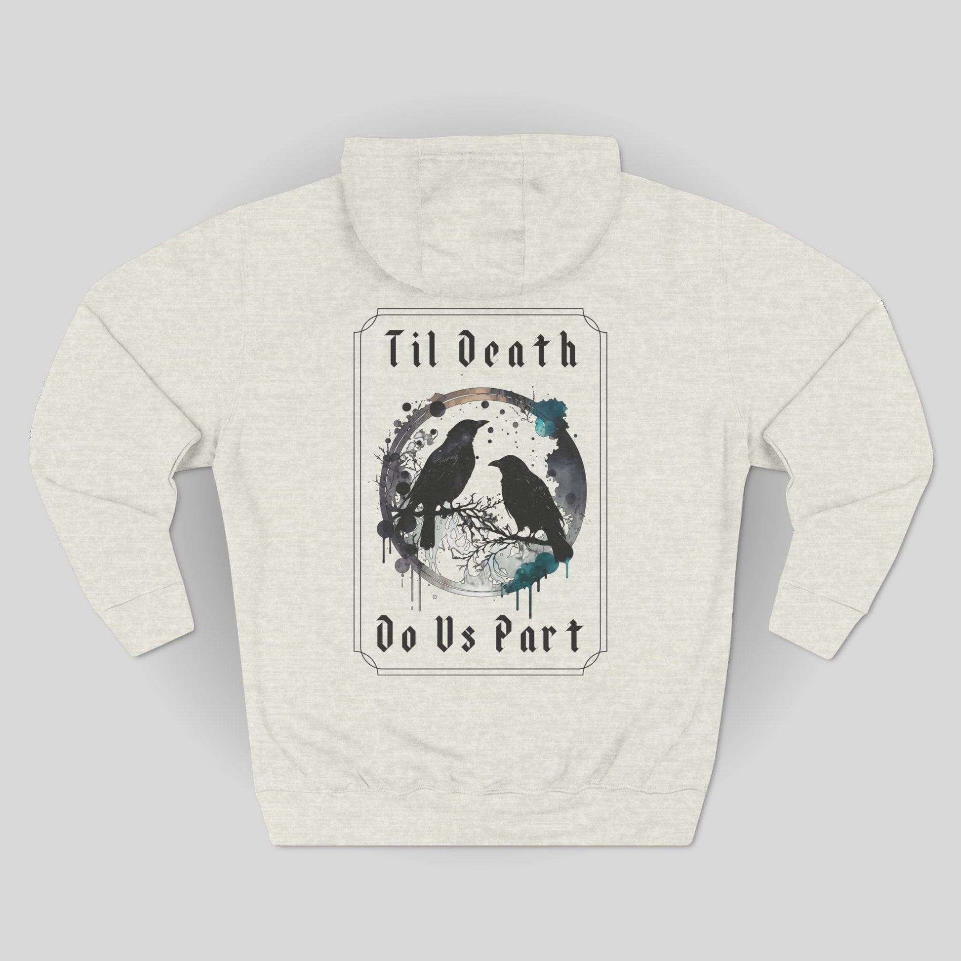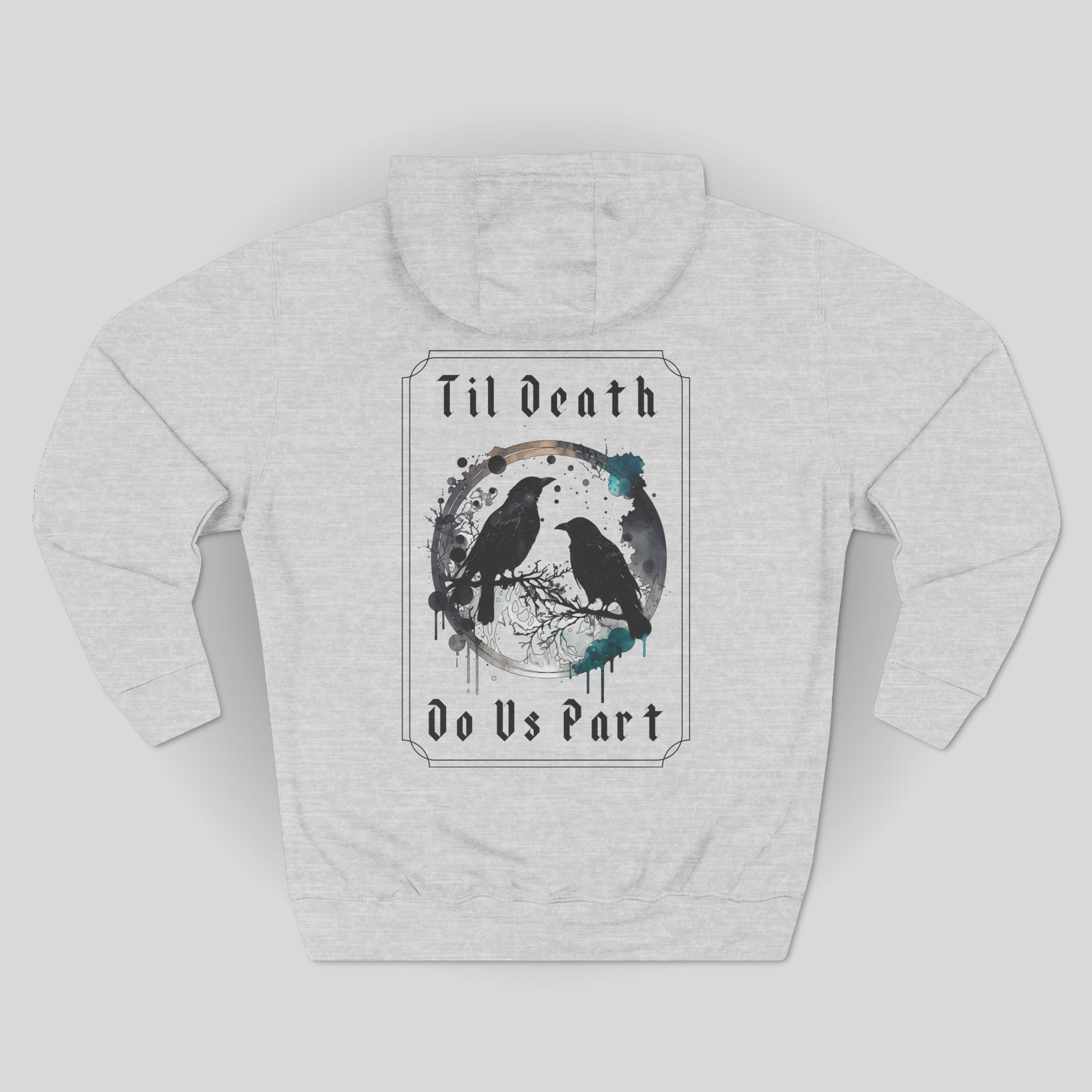 A raven gothic hoodie with a 'til death do us part' design, perfect for those with a darker aesthetic. This hoodie provides a cozy and warm feel, ideal for wearing during spooky season or gothic-themed events. Target audience includes fans of gothic fashion and Halloween enthusiasts.